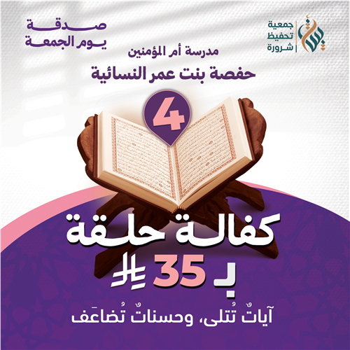 اجعل لصدقتك أثرًا يبقى مع كل تلاوة. بمساهمة قدرها 35 ريالًا للسهم تشارك في كفالة حلقة قرآنية لطالبات مدرسة أم المؤمنين حفصة بنت عمر بحي منفوحة ، لتستمر الحلقات انتظامًا وتعليمًا طوال الفصل الدراسي.